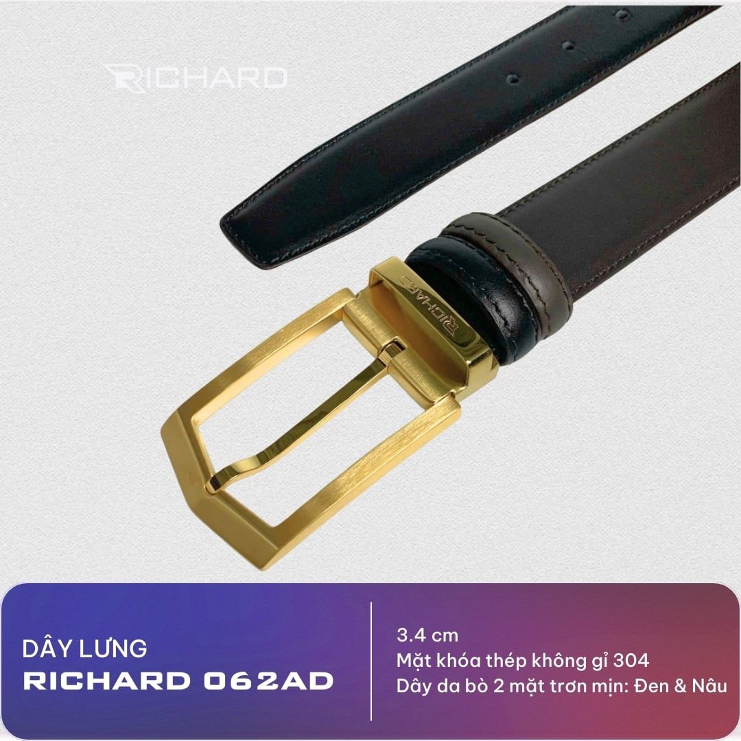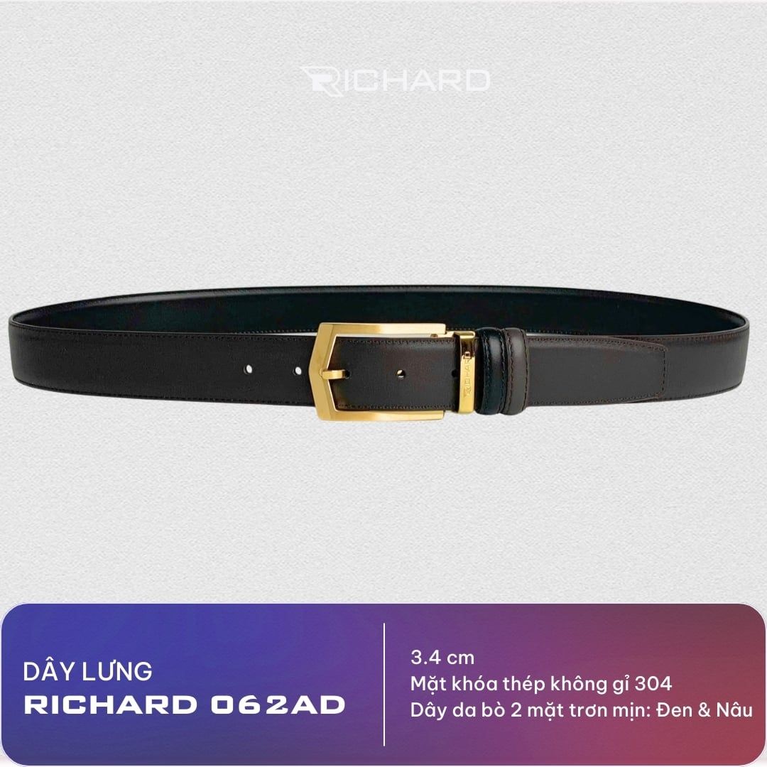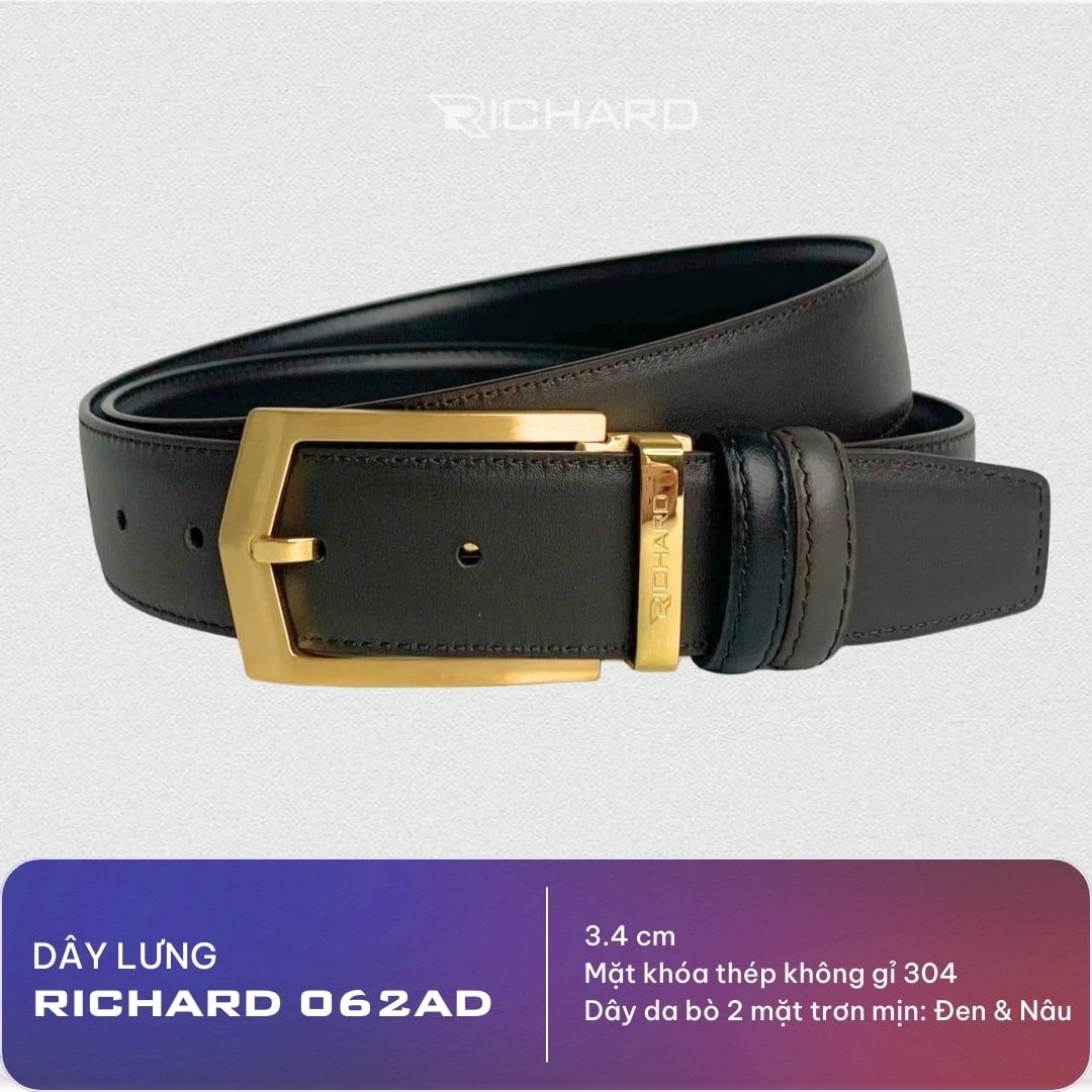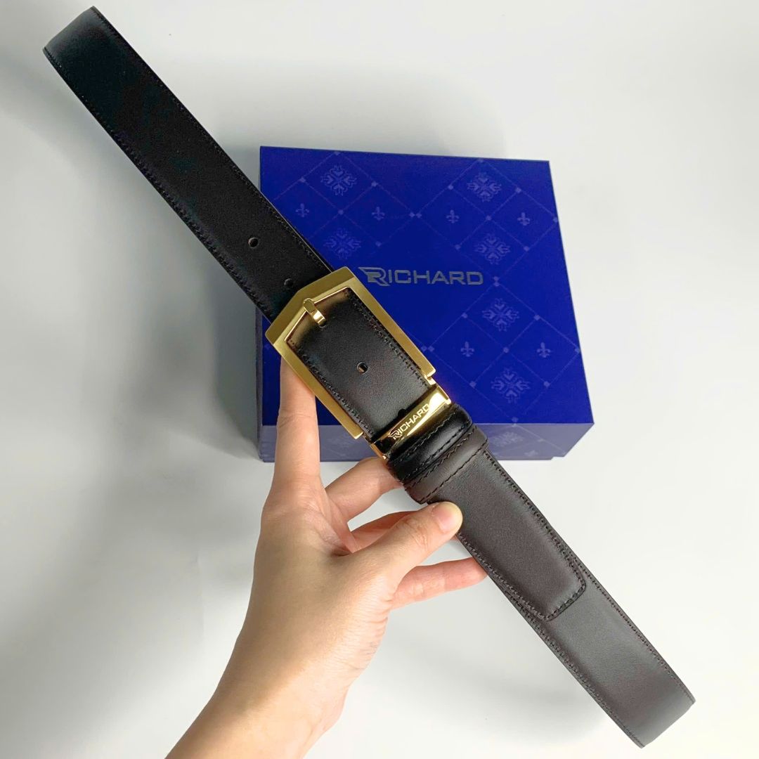 Dây lưng nam da bò nâu đen mịn 3.4 cm mặt khóa thép không gỉ Richard RC062AD
