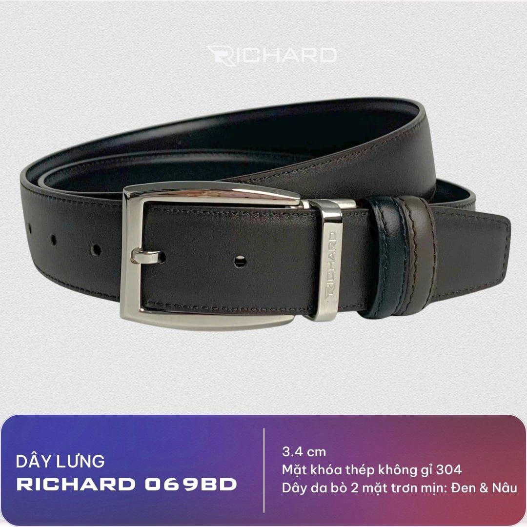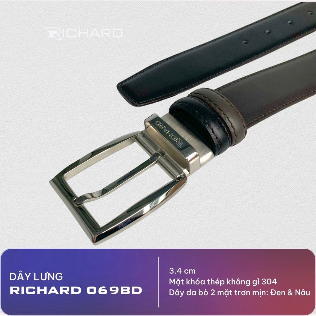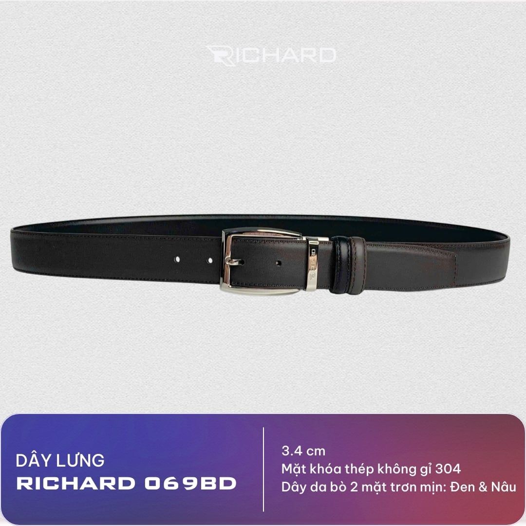 Dây lưng nam da bò nâu đen mịn 3.4 cm mặt khóa thép không gỉ Richard RC069BD